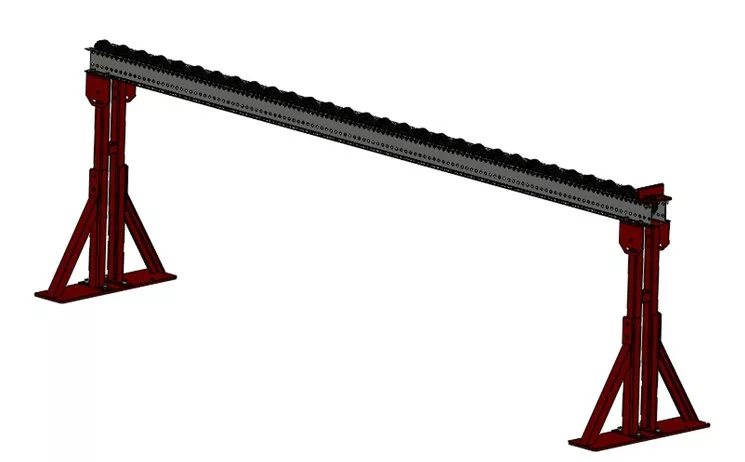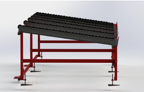 - Gravity roller conveyor including powder coated steel frame and wood stops.